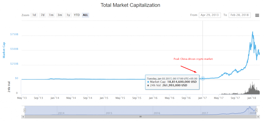 By targeting Chinese citizens continuing to purchase and trade cryptocurrencies, China’s crackdown is perhaps nearing its final gong. The country’s influence on global crypto markets, however, are irrelevant at this juncture. Global cryptocurrency markets at the turn of 2017, prior to China’s hostile moves, were valued just under $20 billion. A year later in January this year, the overall crypto market cap reached an all-time high of $795 billion.