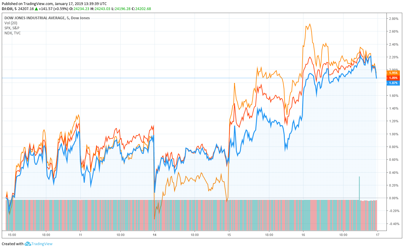 One day, the Dow and its sisters point north after US President Donald Trump tweets that the US and China are close to reaching a new trade agreement and firms such as United Airlines report that the government shutdown has not affected their bottom line.