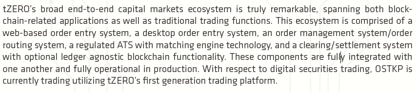 Establishing an enhanced tZERO platform is the principle goal of tZERO. The platform has been operational since 2016, when it began offering trades of Overstock’s Blockchain Voting Series A Preferred Stock (OSTKP). It executes trades using blockchain technology. The company plans to scale up the platform to be capable of trading security tokens (tokens or coins defined as securities under US securities laws). The company acknowledges the immense challenges they face in scaling up their platform to be able to handle security tokens. They do not expect the tZERO platform to be utilized in the same manner for the trading of security tokens as it currently is for OSTKP. Below is an image of the eZERO platform in operation in the trading of OSTKP.