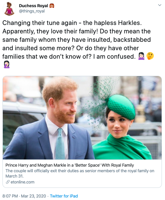 Meghan wants Harry to remain close to his family. There’s no question about that. It’s been a tough time but at the end of the day he still loves his family and that won’t change and hasn’t changed. He has always been close to his grandmother and he very much wants her to have time with Archie, he loves seeing them together.